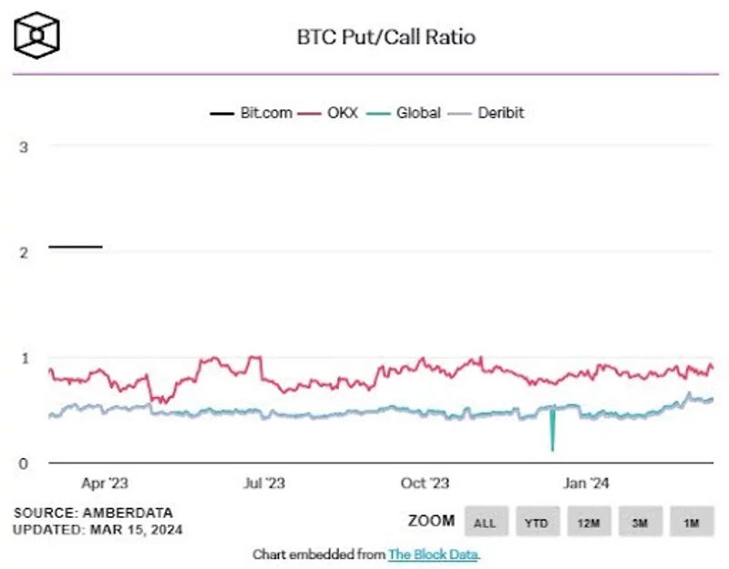 Razmerje med nakupnimi in prodajnimi opcijami, ki je nižje od ena, se na splošno razume kot znak, da aktivnost nakupnih opcij presega aktivnost prodajnih opcij, kar pomeni, da je razpoloženje na trgu bikovsko. Trgovci, ki kupujejo nakupne opcije, so običajno optimistični glede smeri gibanja trga, medtem ko tisti, ki kupujejo prodajne opcije, veljajo za medvedje. Po podatkih družbe The Block na trgu opcij na bitcoine trenutno prevladuje družba Deribit, ki gosti približno 90 % vseh odprtih interesov, današnje razmerje med prodajnimi in nakupnimi opcijami pa je znašalo 0,58.