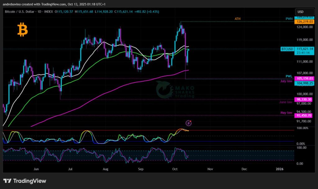 Bitcoin začenja ta teden pri 115,1k, po enem najbolj divjih vožnjah tega cikla s 17/20 % padcem, odvisno od borze, in ogromno 19,14k B likvidacijo, ki je izbrisala tako čezmerno obremenjene bikove kot nestrpne medvede. Od čiste evforije do surovega strahu v nekaj dneh, trg zdaj stoji na razpotju. Ali bodo bikovi obdržali ključno 100k območje in ponovno prevzeli zagon, ali bodo medvedi udarili s odločilnim udarcem, ki bo zapečatil naslednji velik premik? 🌩 😈 🔪