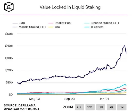 Eden od vodilnih subjektov na tem področju, Lido, trenutno nadzira operacije stav za ether v vrednosti približno 35 milijard USD, kar poudarja pomemben obseg dejavnosti stav v omrežju Ethereum.