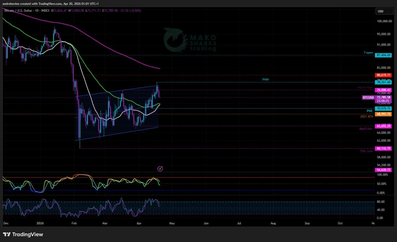 Bitcoin je teden začel pri 73.800 USD! Biki so za seboj pustili močan teden, a pravi preizkus jih šele čaka. Zadnji vzpon je ceno potisnil naravnost na tedensko 21-dnevno drsečo sredino (21SMA), ki je delovala kot odpornost in ohranila BTC znotraj strukture medvedje zastave. »Oranžni mož« še naprej igra pomembno vlogo s svojimi »pogajanji« o TACO, na katera je trg še vedno zelo občutljiv. Cena se trenutno giblje v razponu 60.000–80.000, vendar več dejavnikov še vedno nakazuje v korist medvedov. Ali bodo biki ponovno osvojili ključne ravni in se potisnili nad 80.000, ali pa bodo medvedi ponovno izkoristili geopolitični hrup? 🕊 😠 🔫