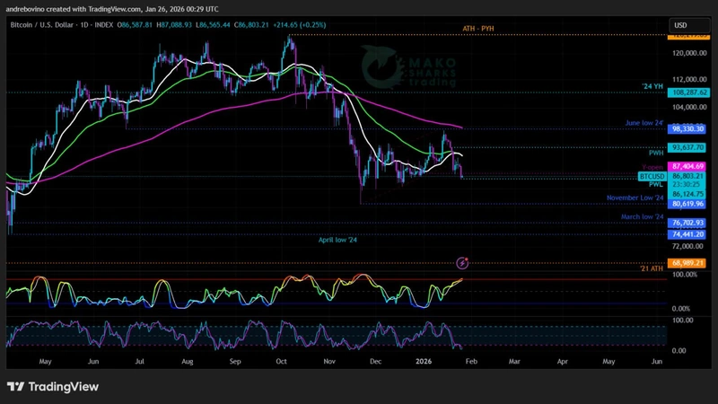 Bitcoin začenja teden pri 86,5 tisoč! Ali bo padec pod 90 tisoč vodil v globlji padec ali bodo biki uspeli pokazati svojo moč?! S časom se sveče še naprej kopičijo v korist medvedov in Nazgûlov… Ali bodo biki ponovno lahko prižgali plamen upanja?! Nekaj ključnih ponovnih osvojitev za bike ali le preprost padec pod 80 tisoč za medvede?! Stvari v kriptosvetu postajajo vse bolj zanimive, napetosti, vznemirjenja in negotovosti na obeh straneh pa ne manjka! 🐈 🍿 ⚰️
