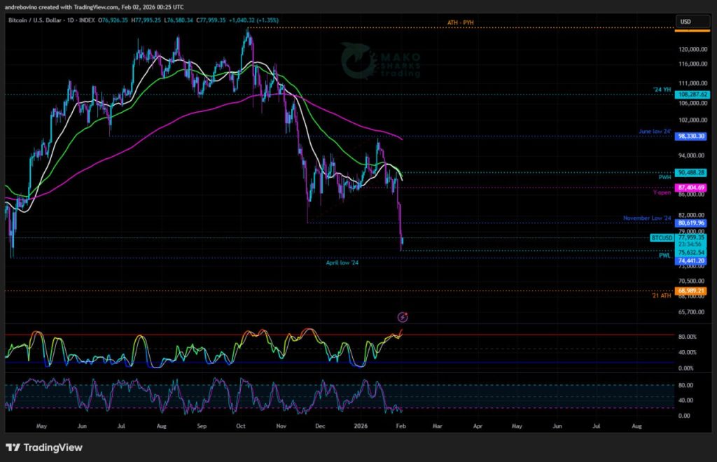 S časom se Bitcoin giblje »vse globlje v Mordor«, saj medvedi in Nazgûli odstranjujejo podporo za podporo, območje za območjem. Misija »novembrska najnižja vrednost ’24 pri 80,6k« je zaključena, nova kratkoročna misija za medvede pa je, da se doseže aprilska najnižja vrednost ’24 pri 74,4k. Kratka konsolidacija z morebitnim manjšim odbojem je zelo verjetna pred gibanjem navzdol proti tedenskemu 200EMA 68,4k in ’21 ATH 68,9k, ki deluje kot makro podpora, ki se mora še dokazati v prihodnjih tednih. Poleg te nove naloge je za medvede idealno, da ostanejo pod mesečno 21SMA 88,9k in letnim odprtjem na dnevni zaključni osnovi, vsak uspešen dnevni zaključek pod tedensko 200EMA 68,4k pa bi zelo verjetno potisnil Bitcoin proti mesečni 55EMA 63,2k nekje v spodnjem območju 60k. 👼 😎 😈