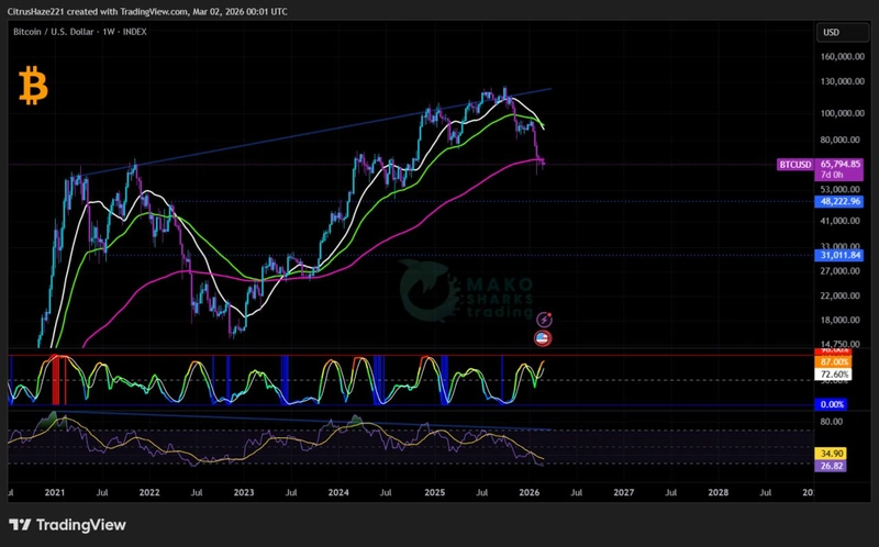 Bitcoin začenja teden pri 65,7 tisoč! Februarski BTC se je začel impulzivno in nestabilno, končal pa se je z nihanjem, polnim napetosti in negotovosti! Glede na te žalostne in kaotične dogodke na Bližnjem vzhodu obstaja velika verjetnost, da se bo tudi marec začel impulzivno in se bo negativno in nestabilno odražal na kratkoročnem kriptosvetu ter služil medvedom kot katalizator za začetek testiranja območja 50 tisoč, v katerem bi biki potencialno našli tisto malo sled Hopiuma, iščejoč bolj pomemben odskok in rally medvedjega trga! 🕊 😎 🕊