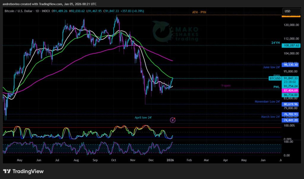 Bitcoin začne teden pri 91,4k! Vstopamo v novo leto z konsolidacijo in negotovostjo, odločilni premik pa nas čaka v prihodnjih dneh. Bodo bikovi vstopili v leto z zaupanjem ali bodo medvedi še naprej diktirali pripoved in tempo? Sprejem nad območjem 95k bi lahko odprl vrata za širitev proti 98k–100k, medtem ko bi zavrnitev verjetno prinesla nov spodnji pritisk. 🥂 🎩 🥂